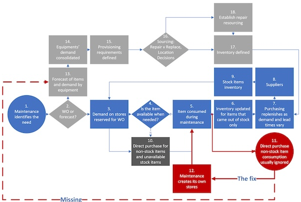 The diagram below shows what is, or should be, happening. The blue steps are often followed, whereas the grey steps are often missed, even with new projects. If all steps are followed, the “consolidation” step (#14) is often handled poorly. The solid red steps highlight the work-arounds maintenance does in order to satisfy operational needs. The dashed red line is typically missing, yet if organizations used it, the hidden maintenance stores could disappear. Missing parts translate into equipment downtime, lost revenue and avoidable workaround costs including maintenance overtime, contractors, spare part stashes, and rushed deliveries.