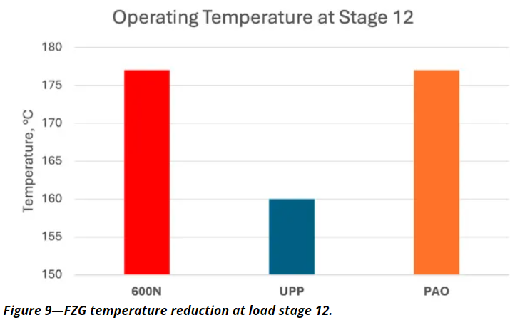Property Test method Target Mineral OGL PAO OGL UPP OGL Kinematic viscosity at 40°C ASTM D445 Report 30,400 20,000 16,500 Kinematic viscosity at 100°C ASTM D445 850-950 877 861 926 Viscosity index ASTM D2270 Report 195 228 258 Pour point, °C ASTM D5950 Report 3 6 -9 Rust protection ASTM D1743 Pass Pass Pass Pass Copper strip corrosion ASTM D130, 100°C, 3 h 1B 1B 1B 1B 4-ball weld point, kgf ASTM D2596 800 620 800 800 LWI, kgf Report 128.8 144.4 145.2 4-ball wear scar diameter, mm ASTM D2266 0.6 0.73 0.50 0.46 Table 10—Type II fluid OGL formulations. Like the Type I OGLs, UPP again seems to have played a role in the reduction of the wear scar compared to the mineral oil OGL. It was also observed that the Mineral OGL does not perform as well as the PAO and UPP OGL in the load carry. These results suggest that base oil modifications and identity to a fluid type OGL may influence overall performance. An additional observation that was made was the decrease in pour point of the UPP OGL compared to the other two fluids, which suggests that the UPP OGL may be easier to handle. In similar fashion to the Type I OGL studies, FZG testing was also conducted on the Type II fluid OGLs on the same test stand. The test conditions used were specifically for a fluid type—A/8.3/90. All fluids completed 12 load stages without scuffing. The end of test operational temperatures were compared, using the Mineral OGL as the baseline. The results can be seen in Figure 9.
