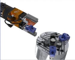 SMW Autoblok now also enables automatic quick jaw change for power chucks. The KNCS-matic chuck can be converted quickly and precisely by a loading robot using a release pin. The automated power chuck ensures that SMW Autoblok meets the current clamping technology requirements, ensuring readiness for the digital factory and machine tending. The KNCS-matic is the latest clamping system in the KNCS power chuck family from SMW Autoblok. The product allows automatic quick jaw change by a conventional industrial robot. This releases the base jaws with a release pin, replaces them and then fixes the next jaws with the pin. Interaction with industrial robots enables the KNCS-matic to achieve short setup times ensuring reliable workpiece clamping with self-centering and repeat accuracy. Operators can work economically with the increasing variations within components, without having to compromise on precision and production quality. The KNCS-matic 3-jaw power chuck is available in six sizes, achieving a total clamping force of 100kN to 250kN depending on the size. The chuck can be used for a wide range of machining operations, since its jaws can be displaced or turned, and each jaw can be moved from 7mm to 10mm. In addition, KNCS-matic has a large passage of 52mm to 165mm typical of the KNCS series. With speeds of 1,700rpm to 6,000rpm,, the KNCS-matic ensures high machining speeds with consistently high precision. The proven Proofline seal from SMW Autoblok makes the chuck low-maintenance. It can be individually adapted to the relevant machining requirements with an extensive range of accessories such as different jaws, an axial stop, and a water flush. SMW-Autoblok supports workpiece processing on the way to the digital factory with automated clamping devices. Together with SMW-Electronics, the company can outfit the process for a fully automated quick jaw change. The jaws of the KNCS-matic can then be replaced with the MX-S mechatronic gripper from the MOTIACT product range. An inductive coupling system such as the F100 enables contactless transmission of energy and signals between the robot arm and gripper, realising its rotation by 360° in both directions for easy jaw change.