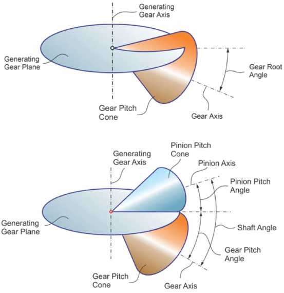 All the older straight bevel gears are generated by rolling on the root cone, rather than on the pitch cone. Figure 1 shows to the left the traditional orientation between the generating plane and the pitch cone of a gear. This orientation violates the kinematic coupling condition between gear, generating plane and pinion. Both mating Coniflex Pro members roll with their pitch cones on the common generating gear plane as shown to the right in Figure 1. This was not possible in the past because the tip circle of the cutting tool had to be adjusted to the root angle of the tapered depth teeth of the gears and due to the mechanical restrictions of older machines, the generating gear rotation was automatically orthogonal to the root line of the cut gear. Thus, the gears were generated on the root cone rather than on the pitch cone.