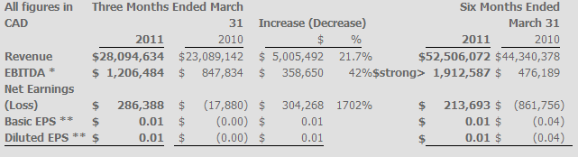 Commercial reported revenue of $28.1 million compared to revenue of $23.1 million for the same period last year, representing a quarter-over-quarter increase of 21.7 percent. The Company reported EBITDA of $1.2 million in the quarter compared to $0.8 million in the same period last year. Net income for the quarter amounted to $0.3 million compared to net loss of $0.02 million during the second quarter of fiscal 2010.
