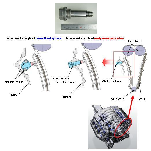· A male thread has been incorporated into the outer edge of the tensioner, and a female thread into the engine cover side to allow the tensioner to be fastened.