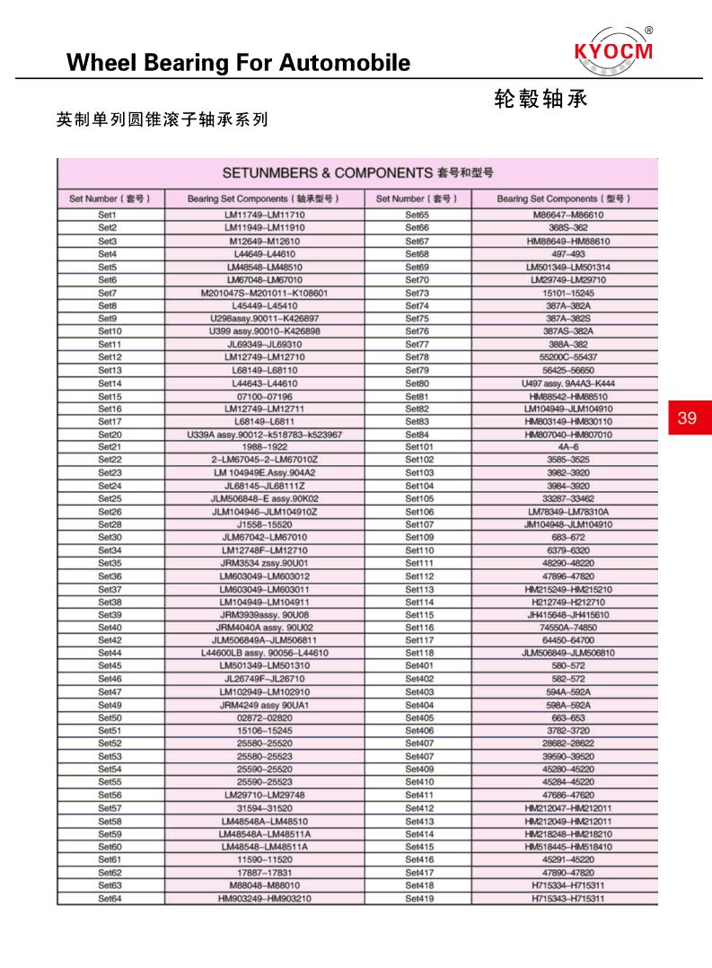 Automotive Hub Unit(4) Air-conditioner Bearings(1) Pillow Block Bearing(2) Wheel bearing(1) Cylindrical Roller Bearings(6) Spherical Roller Bearings(4) Angular Contact Ball Bearings(3) Thrust Ball Bearings(1) Deep Groove Ball Bearings(2) Miniature Ball Bearings(1) Tapered Roller Bearing(5) Automotive Wheel Bearings(6) Self-Aligning Ball Bearings(1)