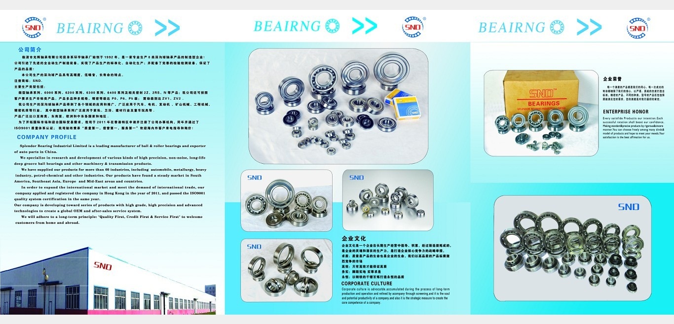 Founded in 1986, Splendor Industrial Bearing Co Ltd has 117 precision CNC grinding machines, 52 sets of corollary equipment, 1 assembly workshop, 2 grinding workshop and a high-end bainite quenching furnace. Equipped with a scientific research office and 17 scientific research facilities, the company has crafted a team with many years of engineering experience including 5 engineers and 11 technicians. The bearing output has reached 9 million sets with an output value of 20 million dollars annually. Our company adopts Japanese NTN technology to produce and manufacture bearing products, mainly producing and selling ball bearings and roller bearings.