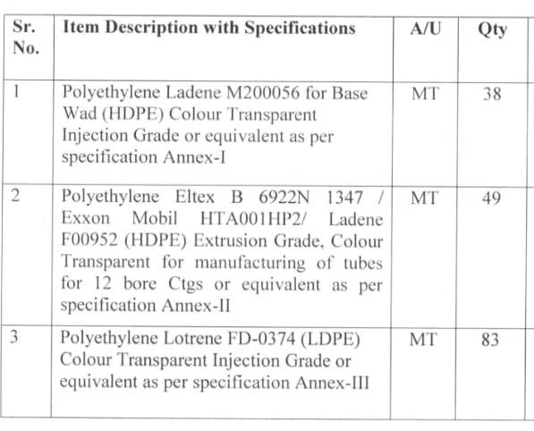 1. Polyethylene Ladene M200056 For base wad colour transparent injection grade;Polyethylene Eltex B 6922N 1347/Exxon mobil Hta001hp2,Ladene F00952 Extrusion grade, colour transparent for manufacturing of tubes for 12 bore CTGS;Polyethylene Lotrene FD-0374 colour transparent injection grade.