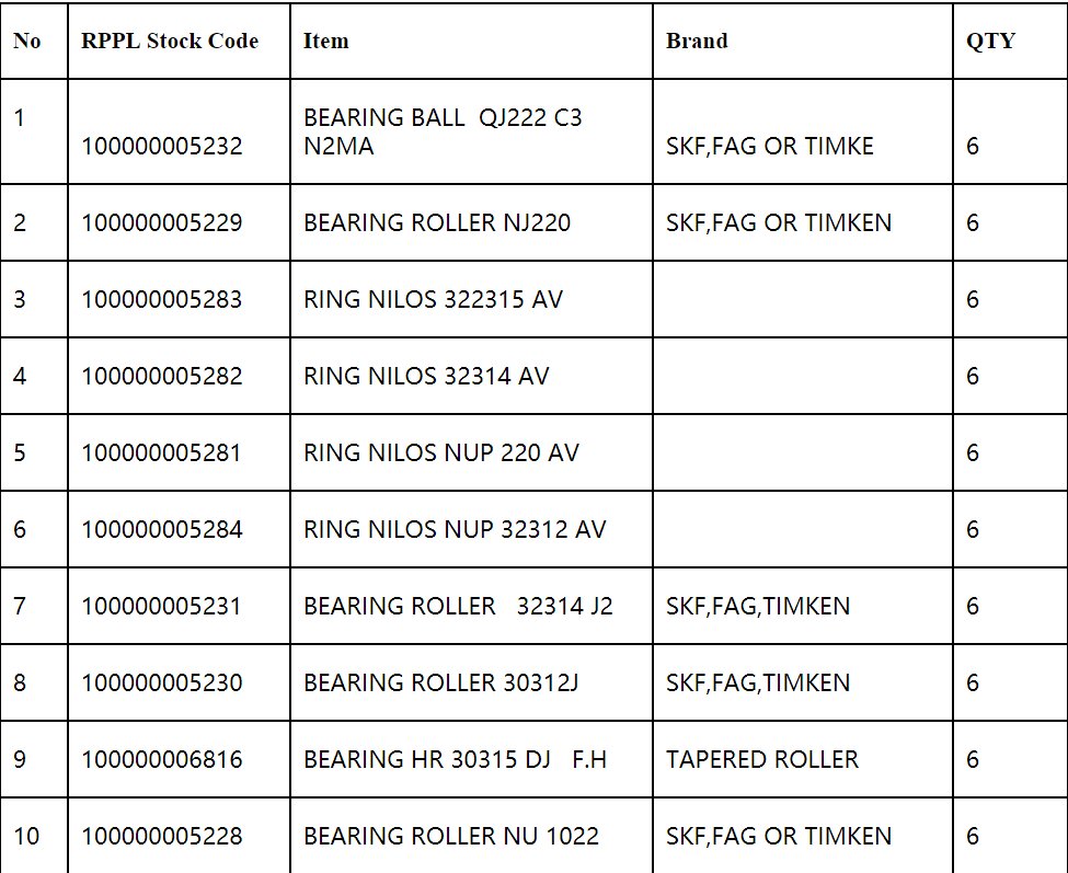 Please send us a quotation for the supply and delivery of the bearings as per the table below: