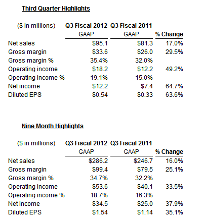For the third quarter of fiscal 2012, the Company reported net income of $12.2 million compared to net income of $7.4 million in the same period last year. Diluted EPS for the third quarter of fiscal 2012 increased 63.6% to $0.54 per share compared to $0.33 per share for the same period last year.