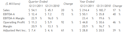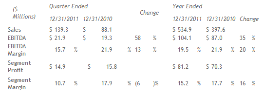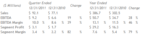 Profits increased in the segment compared to the fourth quarter of 2010, and segment profits improved to $3.1 million. Acquisition-related expenses in the fourth quarter were $0.7 million, including $0.5 million of amortization. As sales and profits increased, the segment’s margins increased to 3.4%.