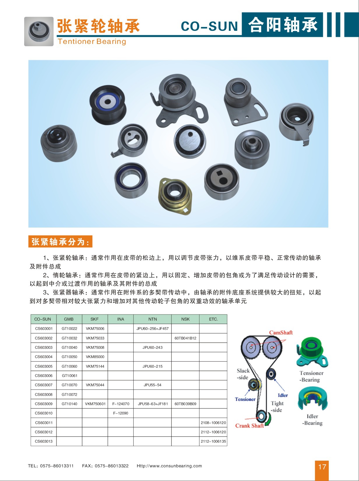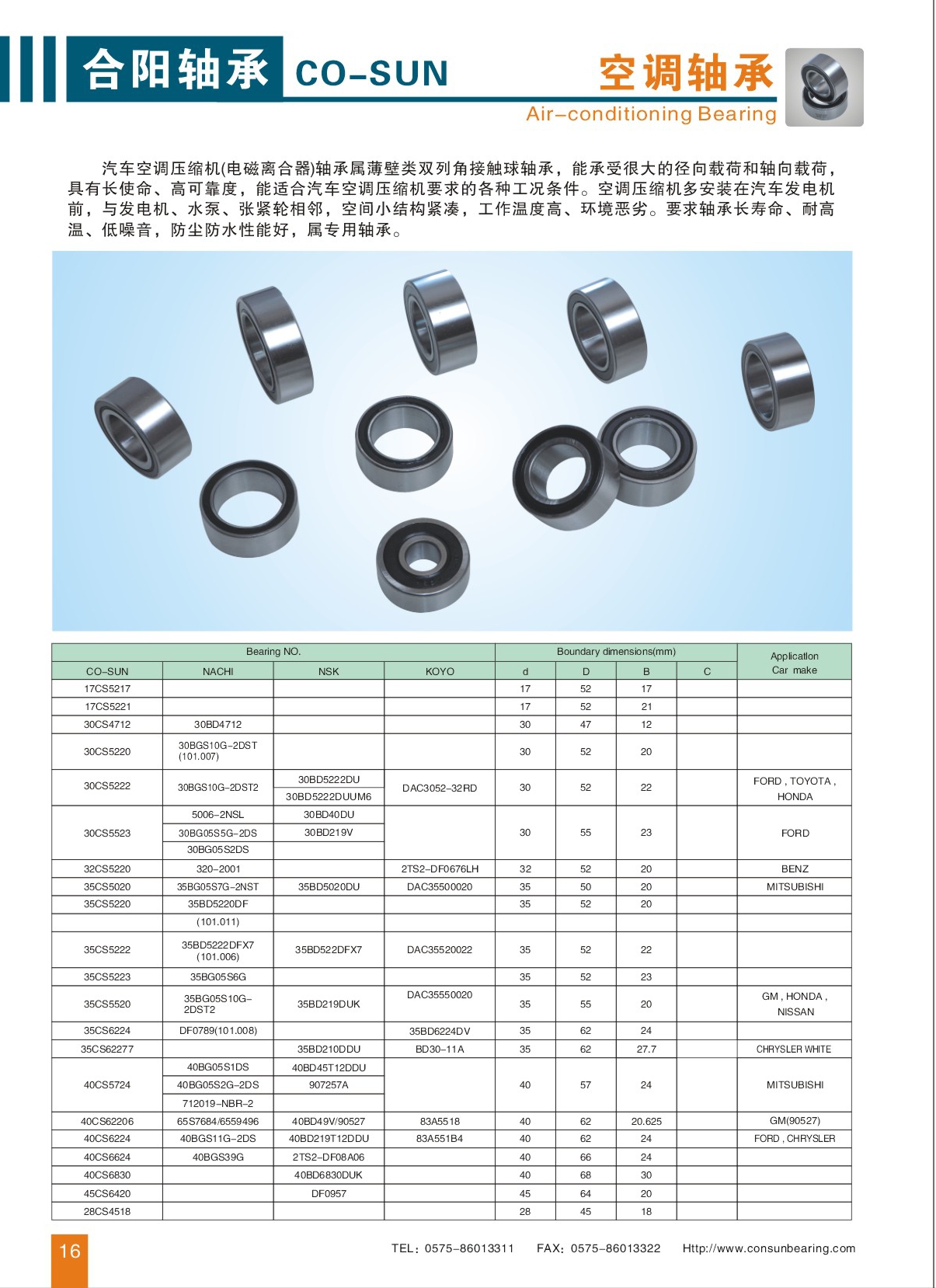 XINCHANG CO-SUN BEARING CO.,LTD.is a professional manufacturer of automobile clutch bearings, air-conditioning compressor bearings and tensioner bearing production-oriented enterprises, the existing 200 to a variety of models, product quality is very reliable. The company has strong technical strength, exquisite production technology, advanced production equipment and testing equipment, strong management and operation team, pay attention to every detail, each batch of product thoroughly to ensure the quality and delivery time, to meet all the requirements of our customers.
