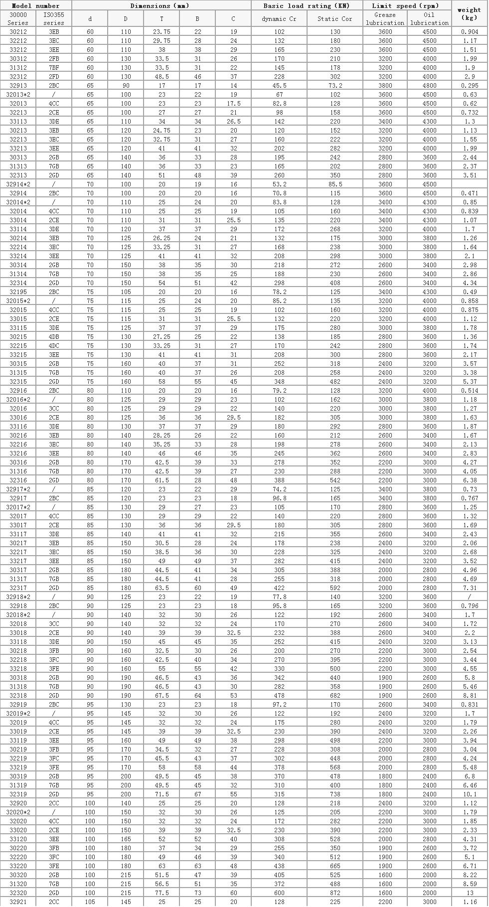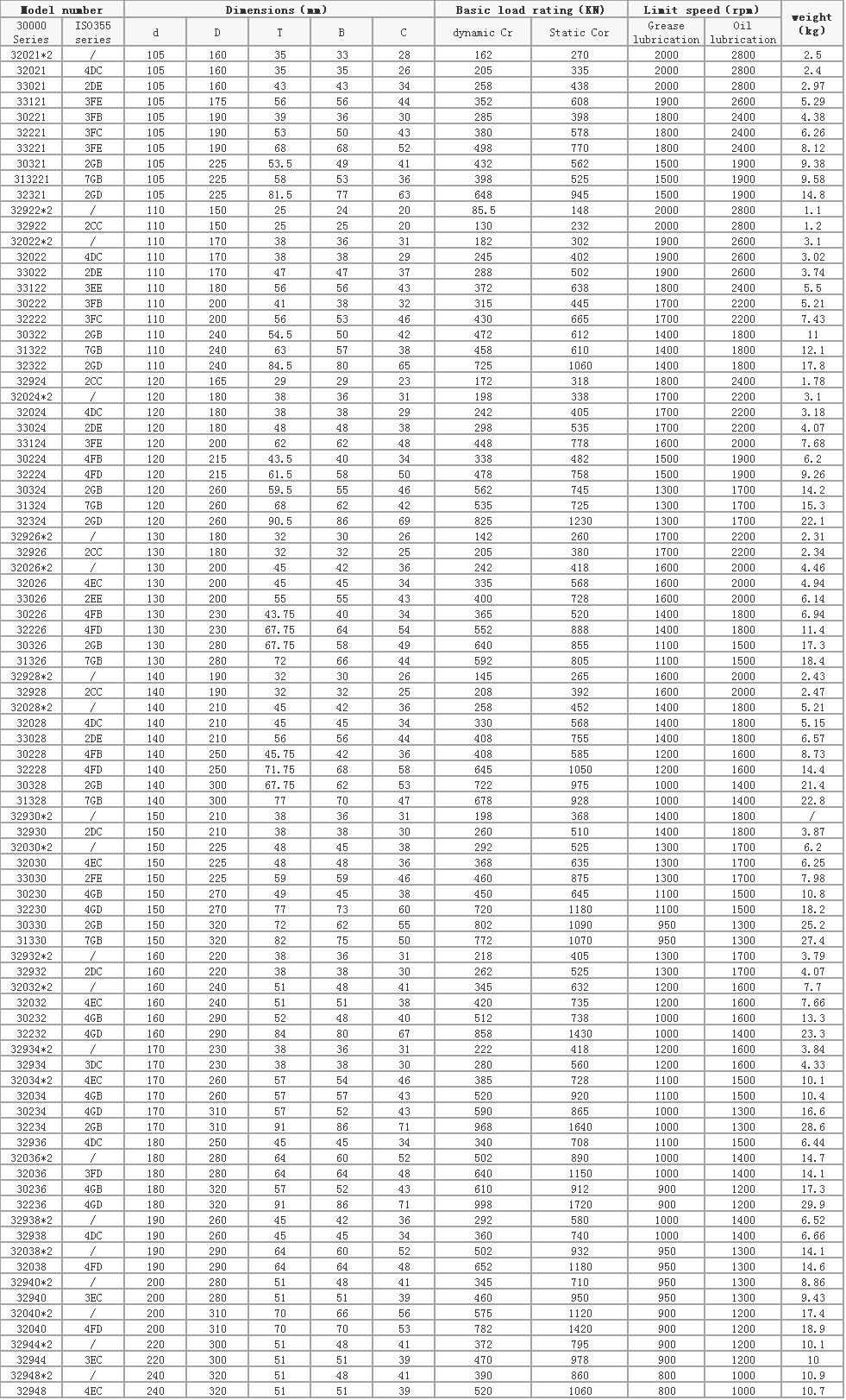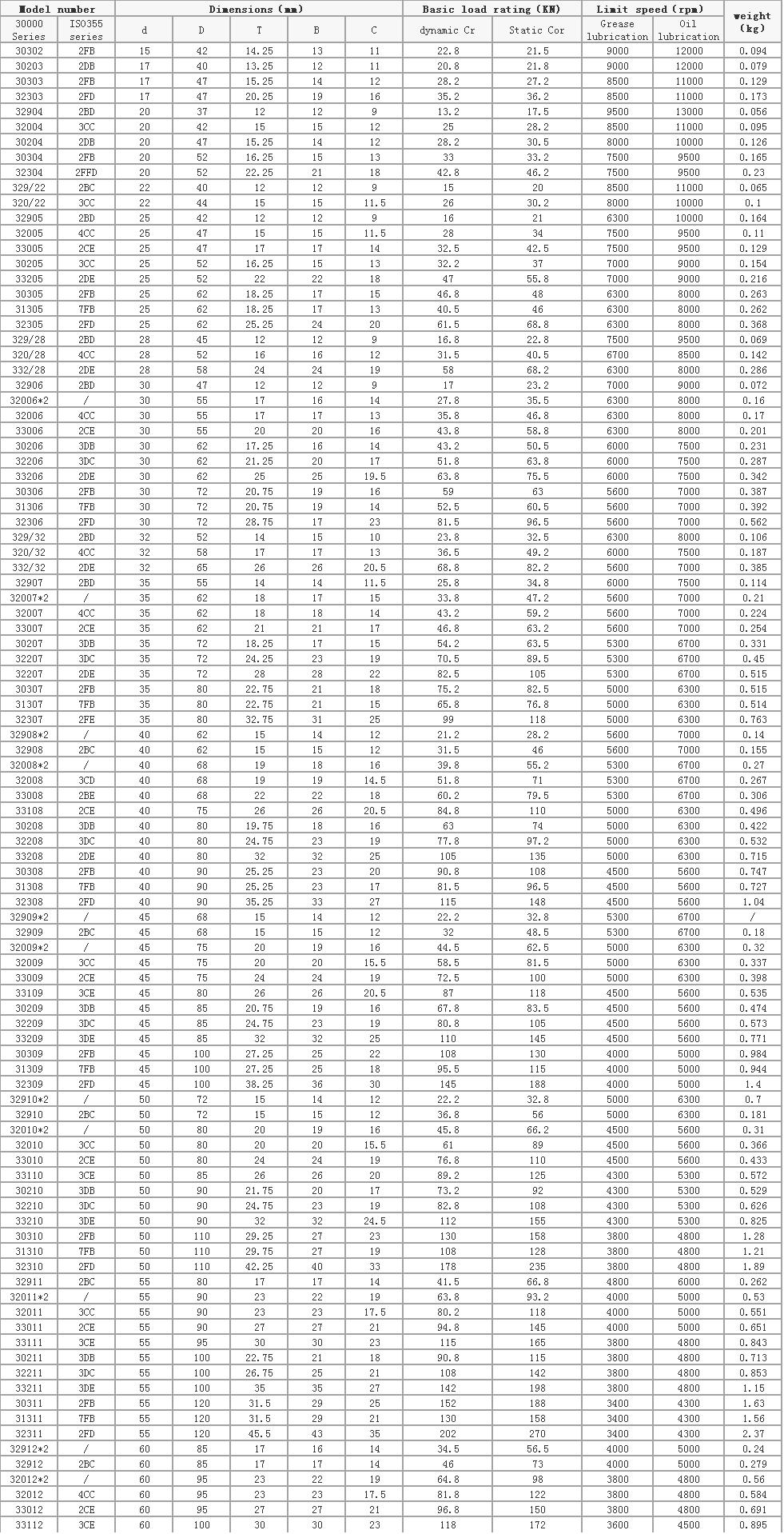 Number: 30302 | 30203 | 30303 | 32303 | 32904 | 32004 | 30204 | 30304 | 32304 | 329/22 | 320/22 | 32905 | 32005 | 33005 | 30205 | 33205 | 30305 | 31305 | 32305 | 329/28 | 320/28 | 332/28 | 32906 | 32006*2 | 32006 | 33006 | 30206 | 32206 | 33206 | 30306 | 31306 | 32306 | 329/32 | 320/32 | 332/32 | 32907 | 32007*2 | 32007 | 33007 | 30207 | 32207 | 32207 | 30307 | 31307 | 32307 | 32908*2 | 32908 | 32008*2 | 32008 | 33008 | 33108 | 30208 | 32208 | 33208 | 30308 | 31308 | 32308 | 32909*2 | 32909 | 32009*2 | 32009 | 33009 | 33109 | 30209 | 32209 | 33209 | 30309 | 31309 | 32309 | 32910*2 | 32910 | 32010*2 | 32010 | 33010 | 33110 | 30210 | 32210 | 33210 | 30310 | 31310 | 32310 | 32911 | 32011*2 | 32011 | 33011 | 33111 | 30211 | 32211 | 33211 | 30311 | 31311 | 32311 | 32912*2 | 32912 |