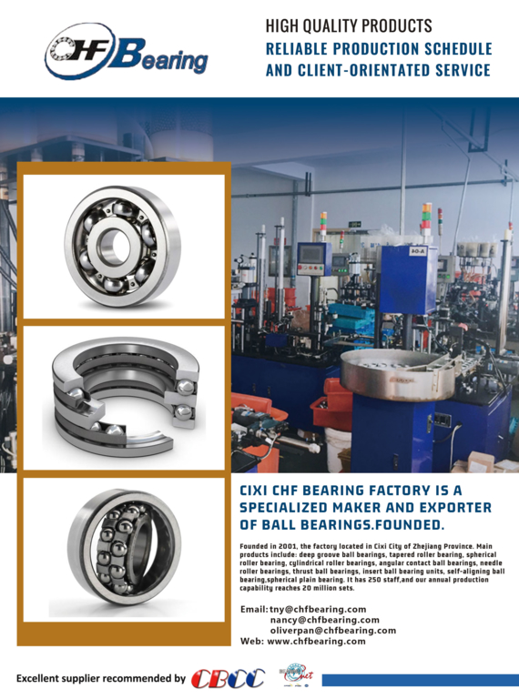 Cixi CHF Bearing Factory is a specialized maker and exporter of ball bearings. Our company was founded in 2001, located in Cixi City of Zhejiang Province. Our products include: deep groove ball bearings,tapered roller bearing, spherical roller bearing,cylindrical roller bearings,angular contact ball bearings, needle roller bearings, thrust ball bearings, insert ball bearing units, self-aligning ball bearing,spherical plain bearing. Now we have 250 staff,and our annual production capability reaches 20 million sets.