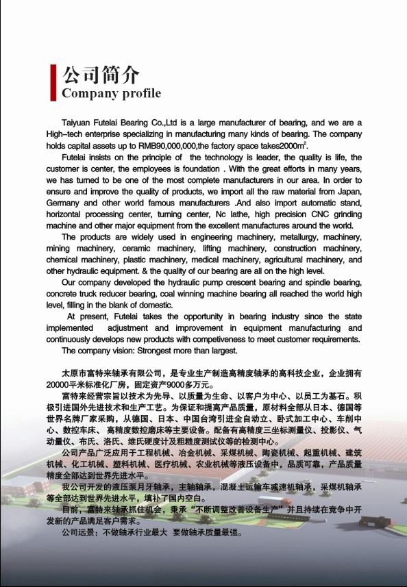We are a hi-tech enterprise which mainly develops high precision bearings, non-standard bearings, special bearings and new international bearing products; all the products developed are at international level. As the bearings require special application environment, to manufacture the products with ordinary bearing steel and employ the conventional process will easily cause malfunction such as the fragmentation of bearing and early invalidation. We employ bearing steel of high purity from the Fifth Plant of Shanghai Steel for all the bearings, apply the most advanced CNC processing equipments and adopt the Bainite quenching furnace cryothermal treatment at international advanced level to produce the international-standardized full complement cylindrical roller bearings. All the products of the company have been detected by ultrasonic flaw detection and the company entirely focuses on the development of “replacement for imported bearings”, takes “Specialty Creates Quality, Quality Accomplish Future, the product with 0.01% disqualification will be regarded as waste” as the quality guideline, which will enable you to be unconcerned on the running. Taiyuan Futelai Bearing Co., Ltd Linxi General Agent of Wafangdian Jinfeng Bearing Manufacturing Co., Ltd, located in China, the bearing big world, mainly stocks the bearings of CC, CA and MB types. the products of the company are distributed in the countrywide area and the industries cover metallurgy machinery, mining machinery, port machinery, paper making, cement, coal and engineering machinery, etc.