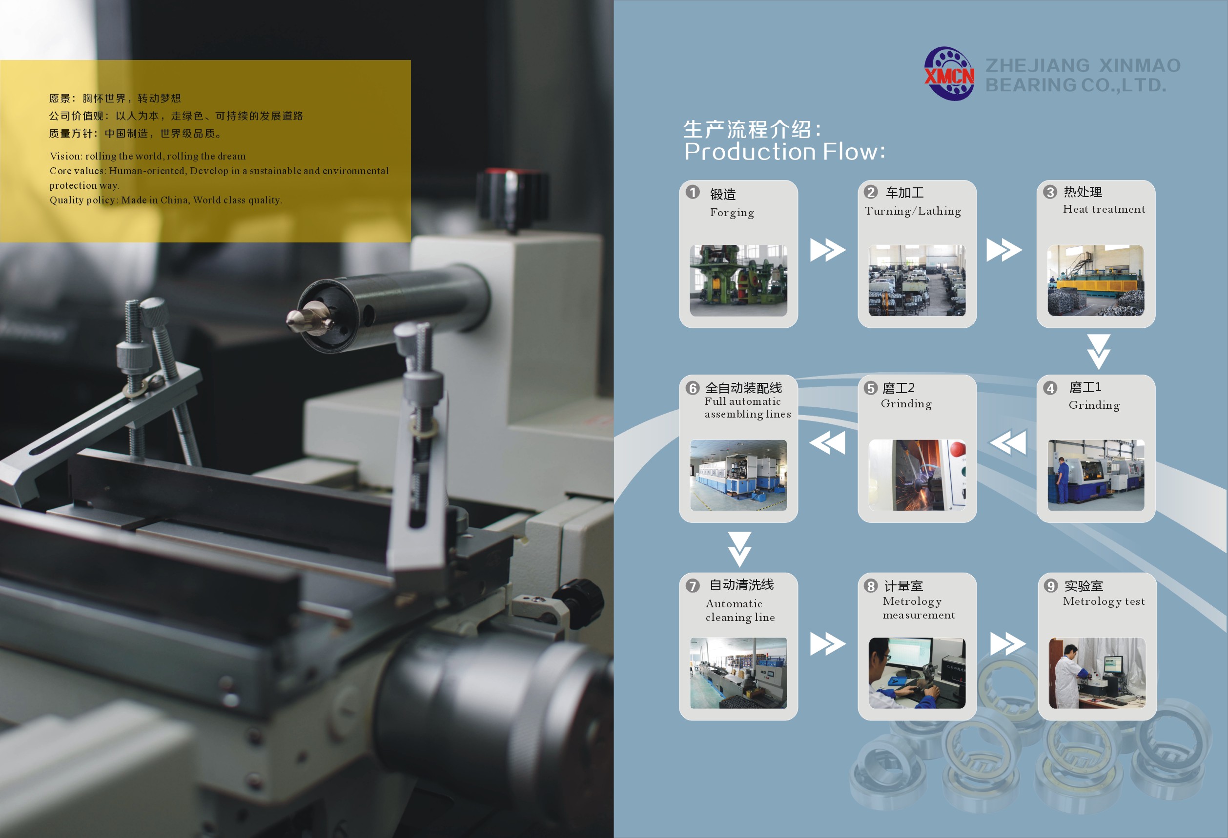 Established in 2004,Zhejiang Xinmao Bearing Co.,Ltd. is an enterprisewhich integrates bearing design, production and trade marketing. It is locatedin the west of Zhejiang province with very convenient traffic, which is 400 KMaway from Shanghai,near the Changshan exit of Hangjinquexpressway. Covering an area of 20,000 square meters, with a construction areaof 15,000 square meters, the company is specialized in manufacture and sale goodquality Tapered roller bearing, Cylindrical roller bearing, Deep groove ballbearing, Spherical roller bearing, Angular contact ball bearing and bearingrings. More than 150 assiduous employees working in thecompany, of those 20 are professional technicians. Ithas complete production flows, including forging, turning, heat treatment,grinding and assembling, which guaranteed the good and stable quality andflexible delivery time. With advanced numerical control turningmachines, advanced heat treatment furnaces, full automatic grinding andassembling production lines and very strictinspection processes, our bearings are widely used in various industries,such as automotives, machine tools, electrical machines, engineeringmachineries, mining machineries, agriculturalmachineries, trailers and so on. Quality first, Credit first and service first is the managing principle of Xinmaobearing. With hard working for these many years, we have established a wholeset of production and sales system, acquiring export license allow us totransfer the quality products worldwide; we also gained a good reputation indomestic and overseas markets for our good quality, stable performance,competitive price and sincere after-sale service. We warmly welcomeyou to visit us at anytime!