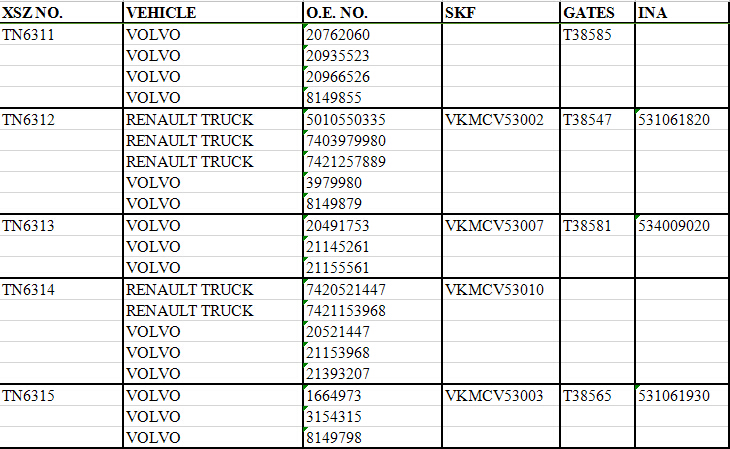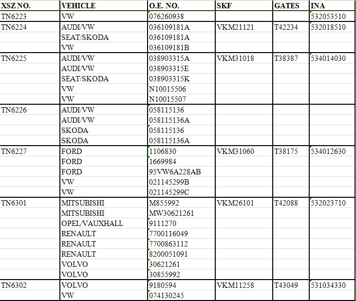 Number: TN6223 | TN6224 | TN6225 | TN6226 | TN6227 | TN6301 | TN6302 | 076260938 | 036109181A | 036109181A | 036109181B | 038903315A | 038903315E | 038903315K | N10015506 | N10015507 | 058115136 | 058115136A | 058115136 | 058115136A | 1106830 | 1669984 | 95VW6A228AB | 021145299B | 021145299C | M855992 | MW30621261 | 9111270 | 7700116049 | 7700863112 | 8200051091 | 30621261 | 30855992 | 9180594 | 074130245 | VKM21121 | VKM31018 | VKM31060 | VKM26101 | VKM11258 | 534014030 | 534012630 | 532023710 | 531034330 |